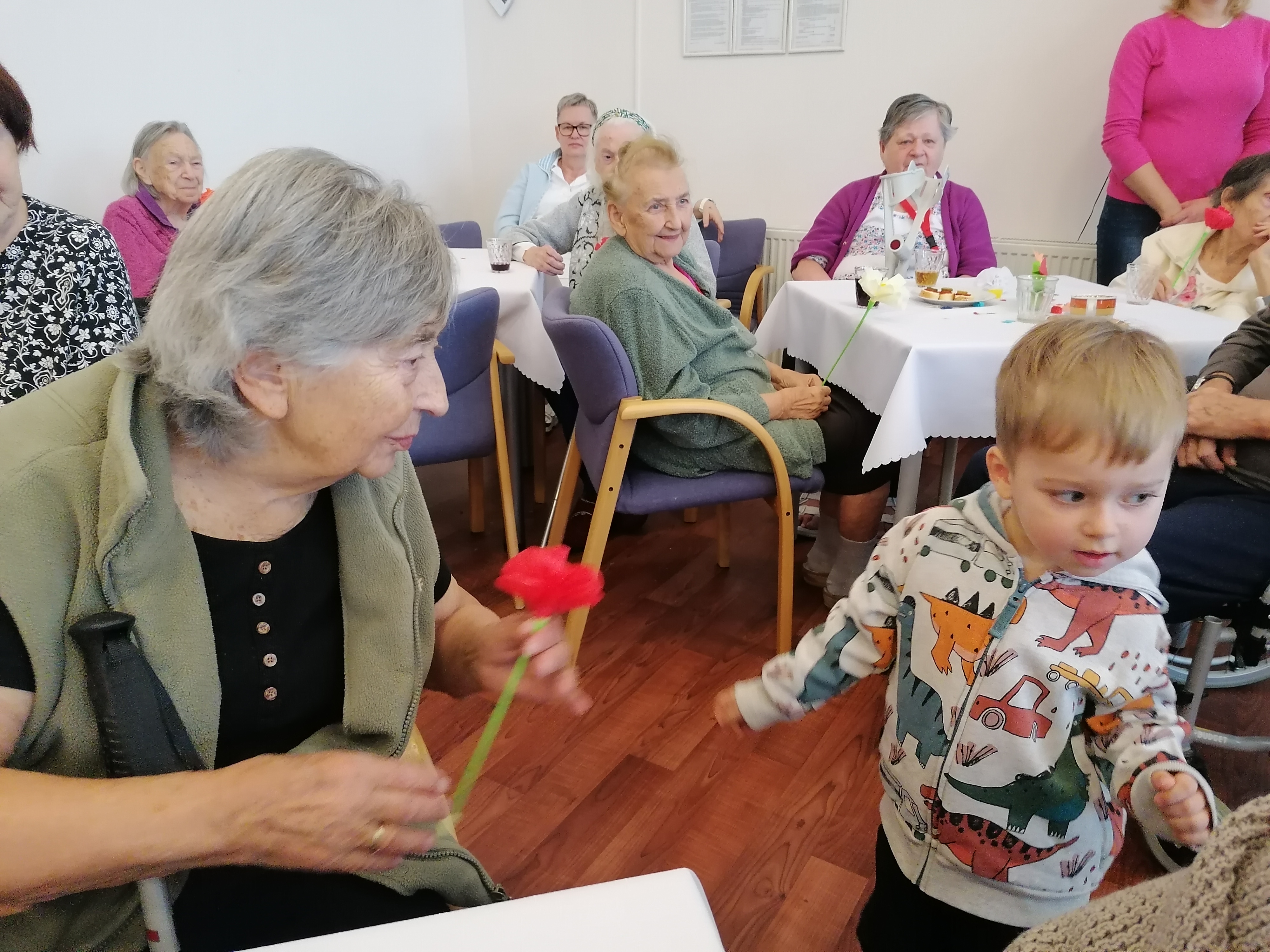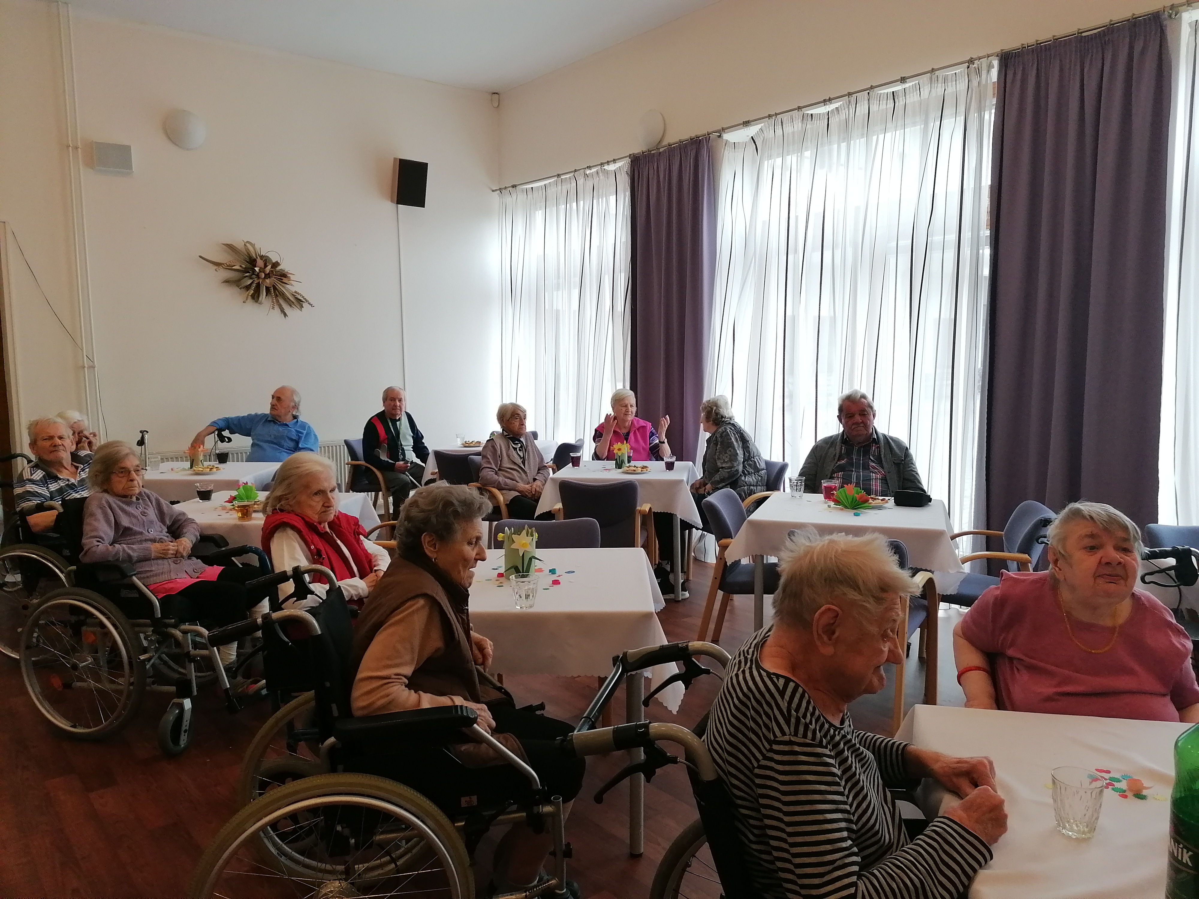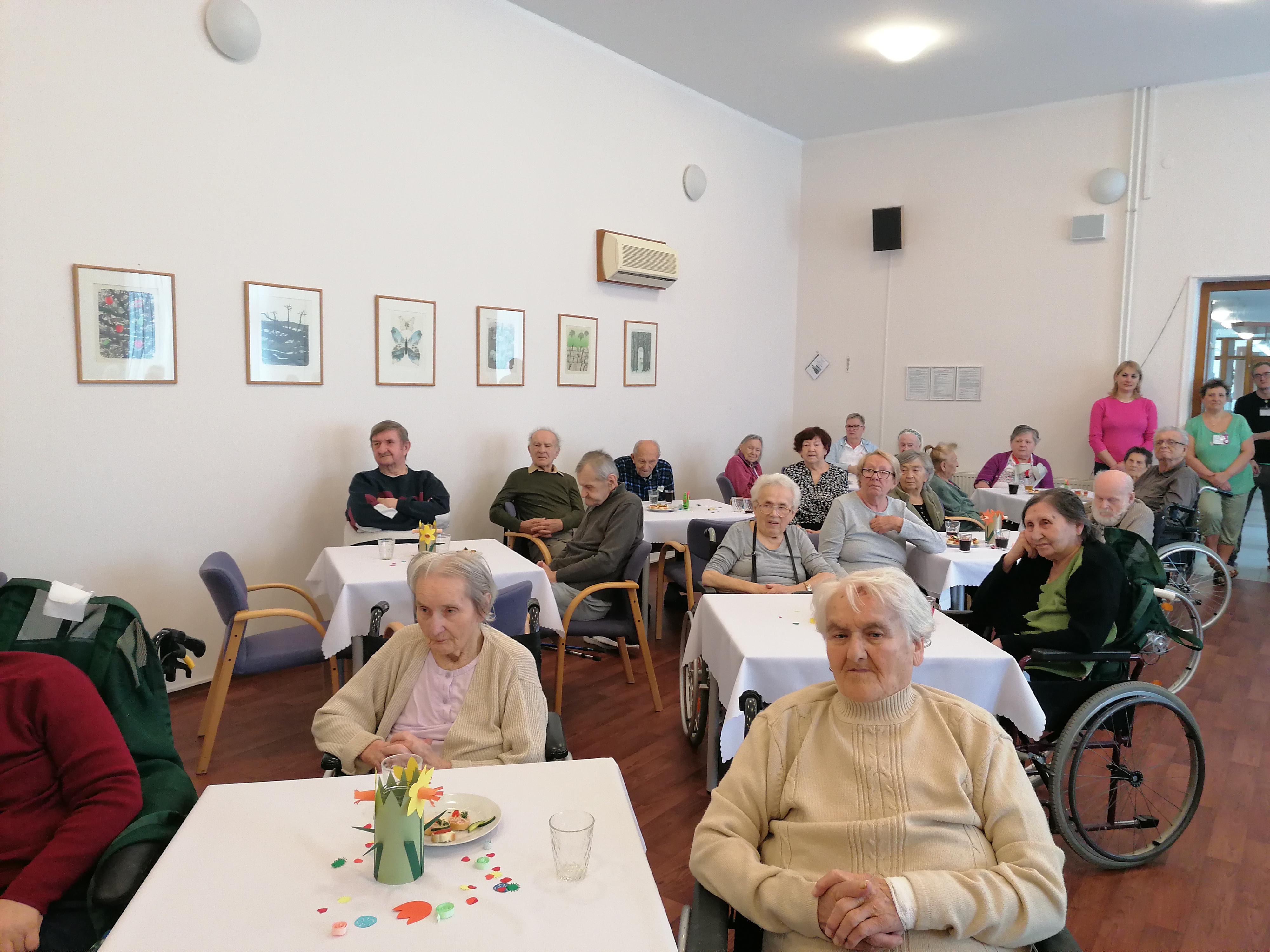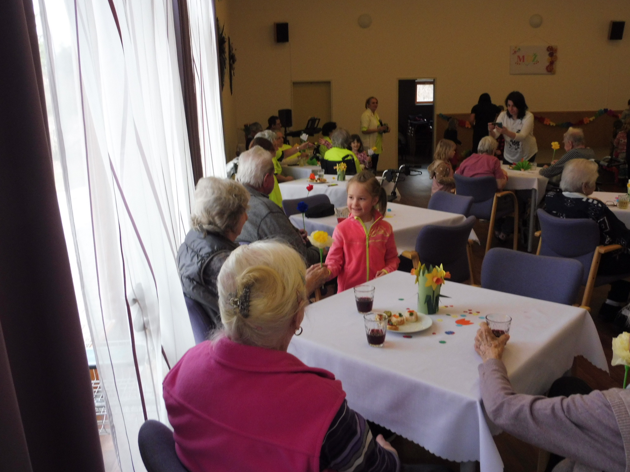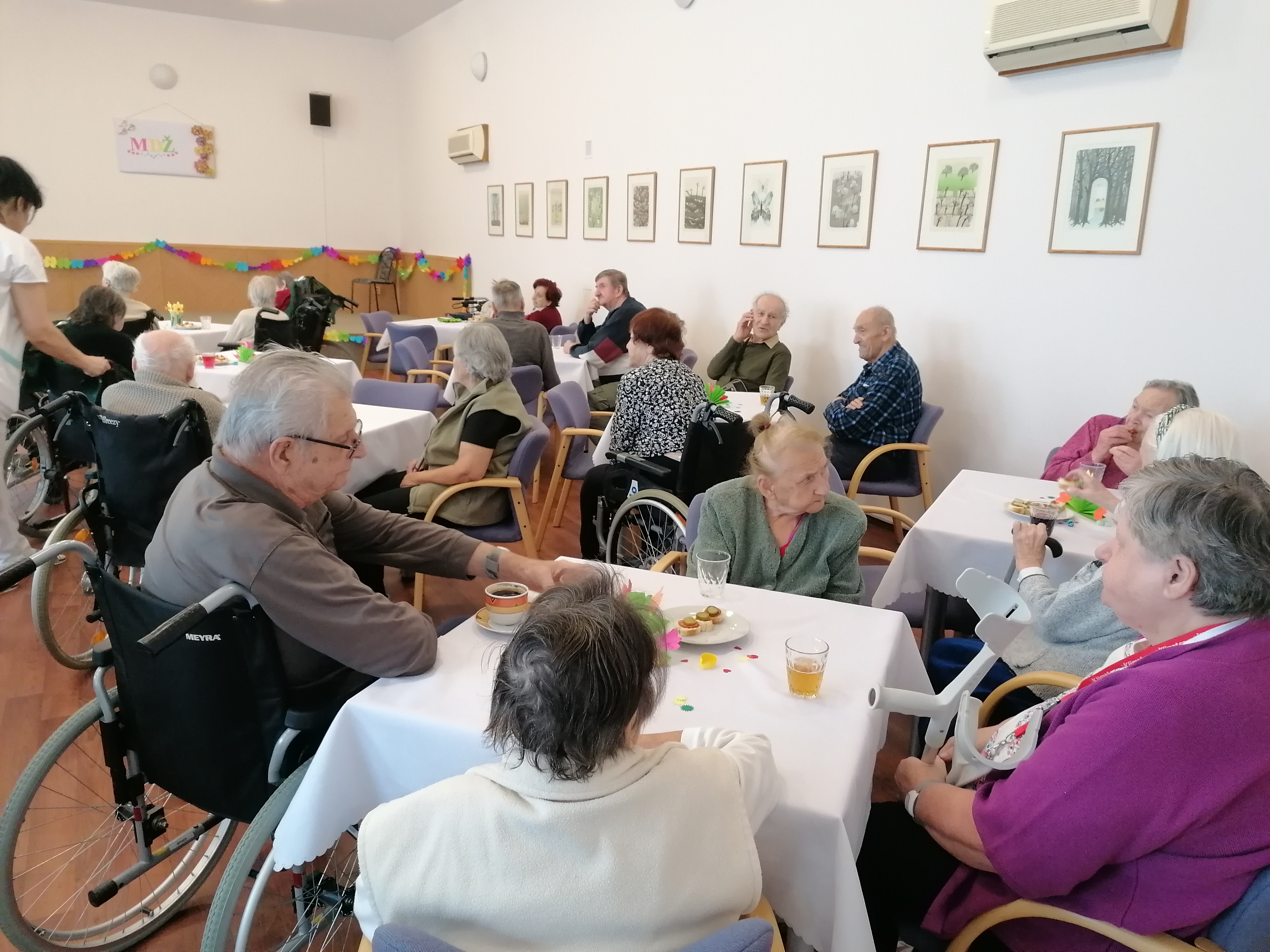 Dnešní den jsme oslavili MDŽ. Děkujeme dětem ze. 4.MŠ Dobříš a jejich učitelkám za krásné pásmo básniček a písniček, rovněž i za květiny, které vyrobili. Zazpívali jsme si s paní Gabrielou Hrubou za hudebního doprovodu pana Miroslava Urbánka (oba z organizace Rukama Nohama). Dopolední program nám zpestřily naše kolegyně, které spolu s klientkami nacvičily vystoupení, a zároveň i naše klientka, jenž nám přednesla básničky. Ještě jednou všem moc děkujeme za zpříjemnění dnešního dne